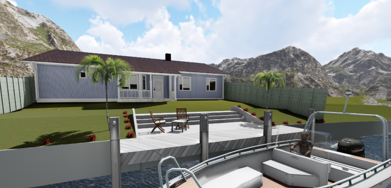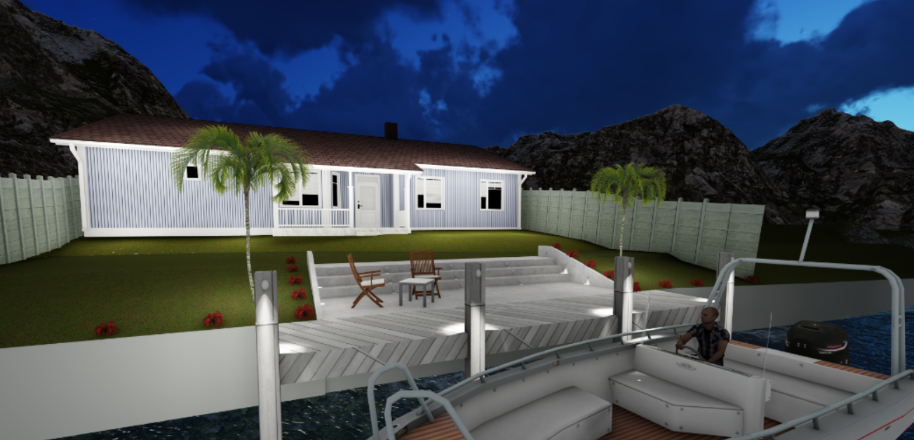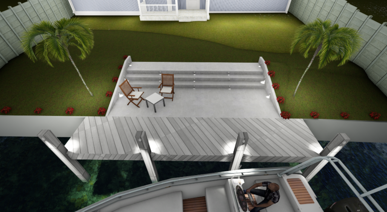 A spacious 45x15 deck and boat dock featuring elegant lighted steps, lined posts, and underwater lighting.